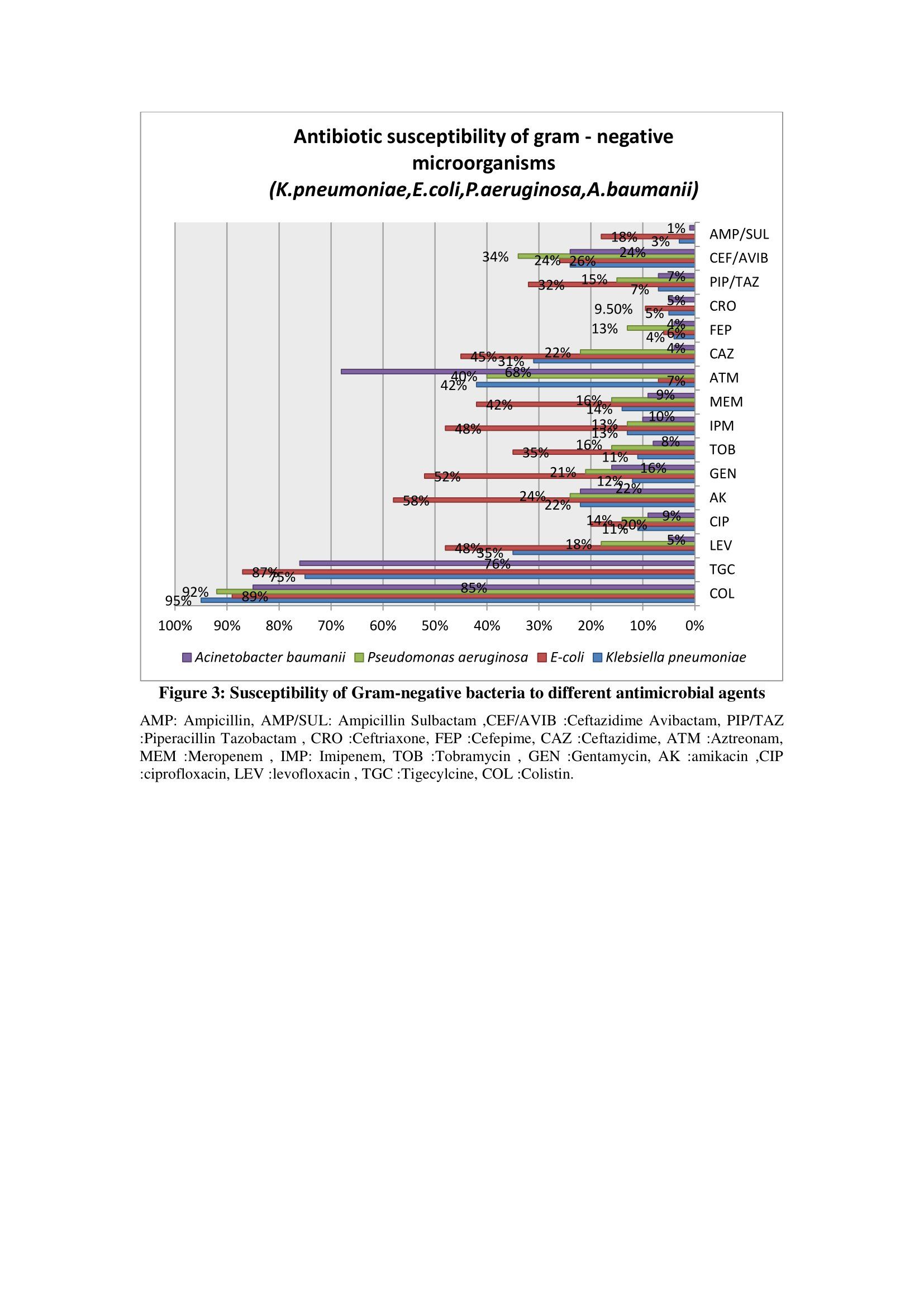 In our investigation, the antibiotic sensitivity of the most often isolated gram-negative infections was extremely variable, revealing that colistin is the most effectively used antibiotic, with sensitivity for K. pneumoniae, E. coli, P. aeruginosa, and Acinetobacter of 95, 89, 92, and 85% respectively. As regards the sensitivity to tigecycline, it was 87% for E. coli, 76% for Acinetobacter, and 75% for K. pneumonia. However, the sensitivity of carbepenem for these organisms was remarkably low. The sensitivity of K. pneumoniae was 14% for imipenem and 13% for meropenem , that of E. coli was 48% for imipenem and 42% for meropenem and that of P. aeruginosa was13% for imipenem and 16% for meropenem while the sensitivity of Acinetobacter was 10% for imipenem and 9% for meropenem) (Figure 3).