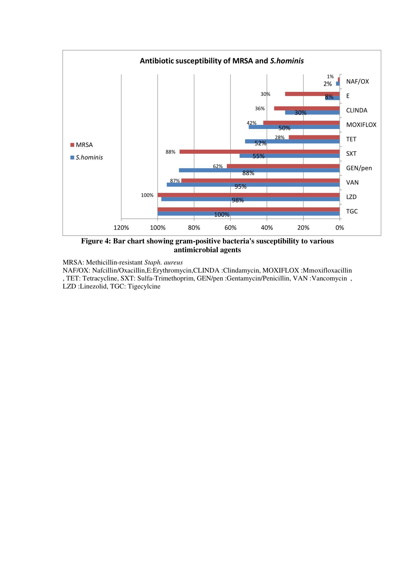 Gram-positive species were recovered from 2649 isolates, with Staph. hominis being the most common (n = 1146, 45.4% of Staph. Isolates and 6.77% of total isolates (Table 2). Staph. haemolyticus was the second most common Staphylococcal isolate (n = 580, 22.9% of Staph. Isolates and 3.42% of total isolates,), followed by Staphylococcus aureus which was isolated in 20.1% of Staphylococcal isolates, 2.99% of all isolates, n=507. Methicillin-resistant Staphylococcus aureus (MRSA) was detected in 18.19% of Staphylococcal isolate (2.7% of all isolates, n = 459 isolates), but Methicillin-sensitive Staphylococcus aureus (MSSA) was found in just 1.9% of Staphylococcal isolates (n = 48 isolates, 0.28% of all isolates) in our investigation (Figure 2).