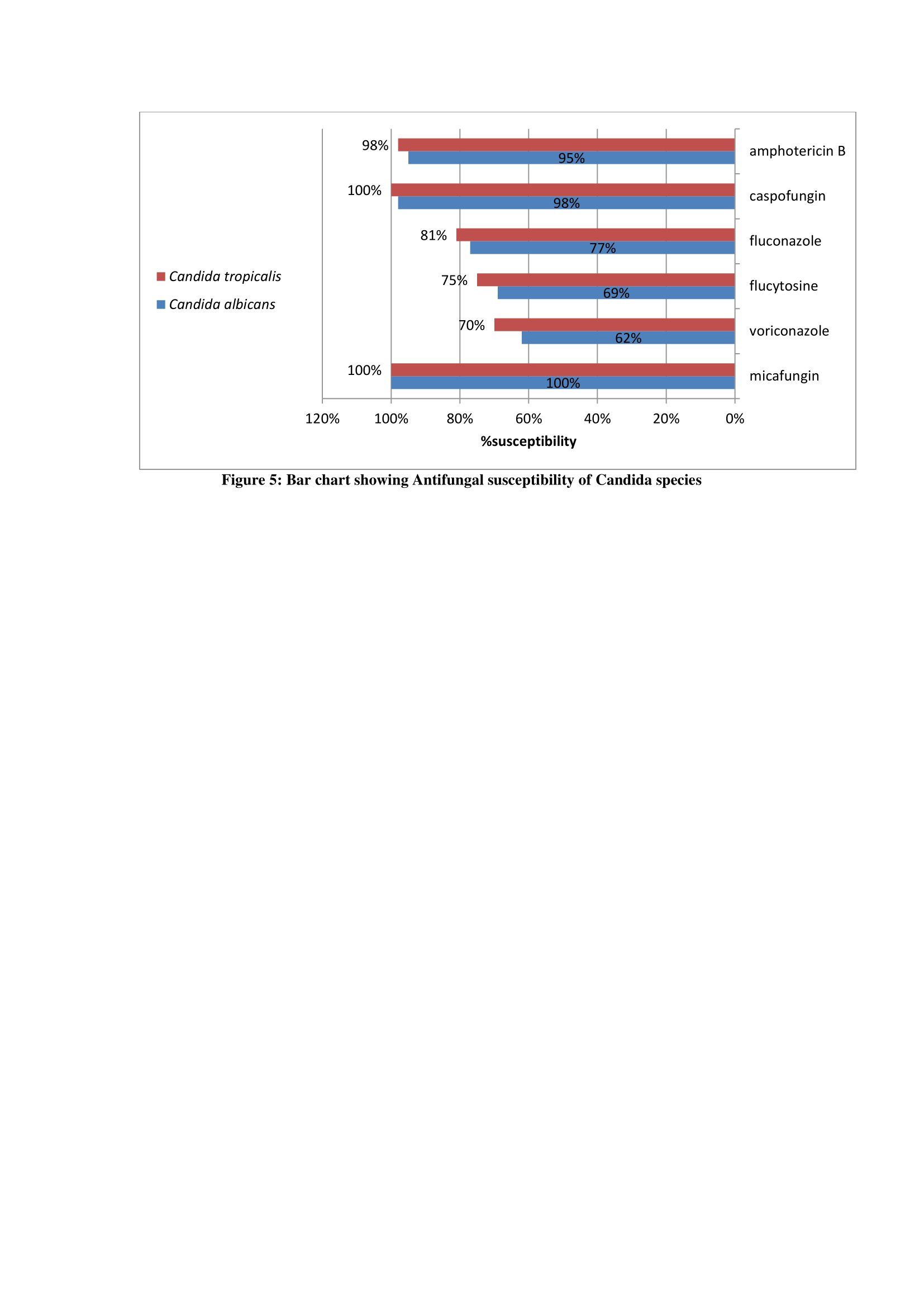 Vancomycin sensitivity was 95% for gram-positive S. hominis and 87% for MRSA (Fig. 3), while linezolid sensitivity was 100% for MRSA and 98% for S. hominis and Tigecycline sensitivity was 100% for both. Fungal infection in our data was less than 1%, predominantly C. albicans (0.05% vs. 0.01% C. tropicalis), with antifungal sensitivity of about 100% for micafungin, caspofungin, and amphotericin B, while other antifungals' sensitivity was lower as shown in (Figure 4).