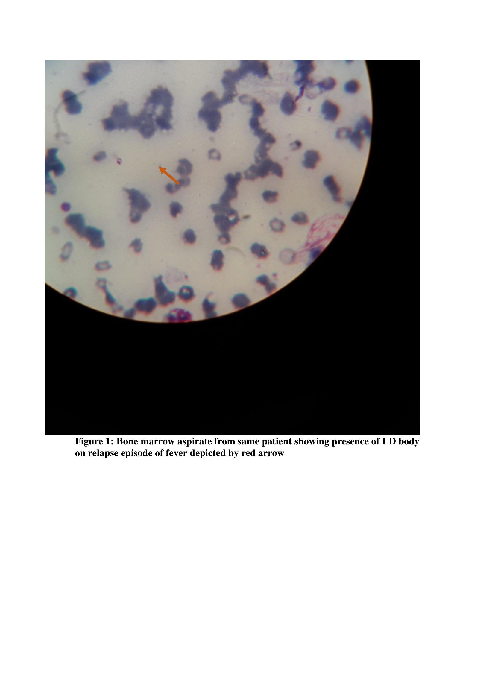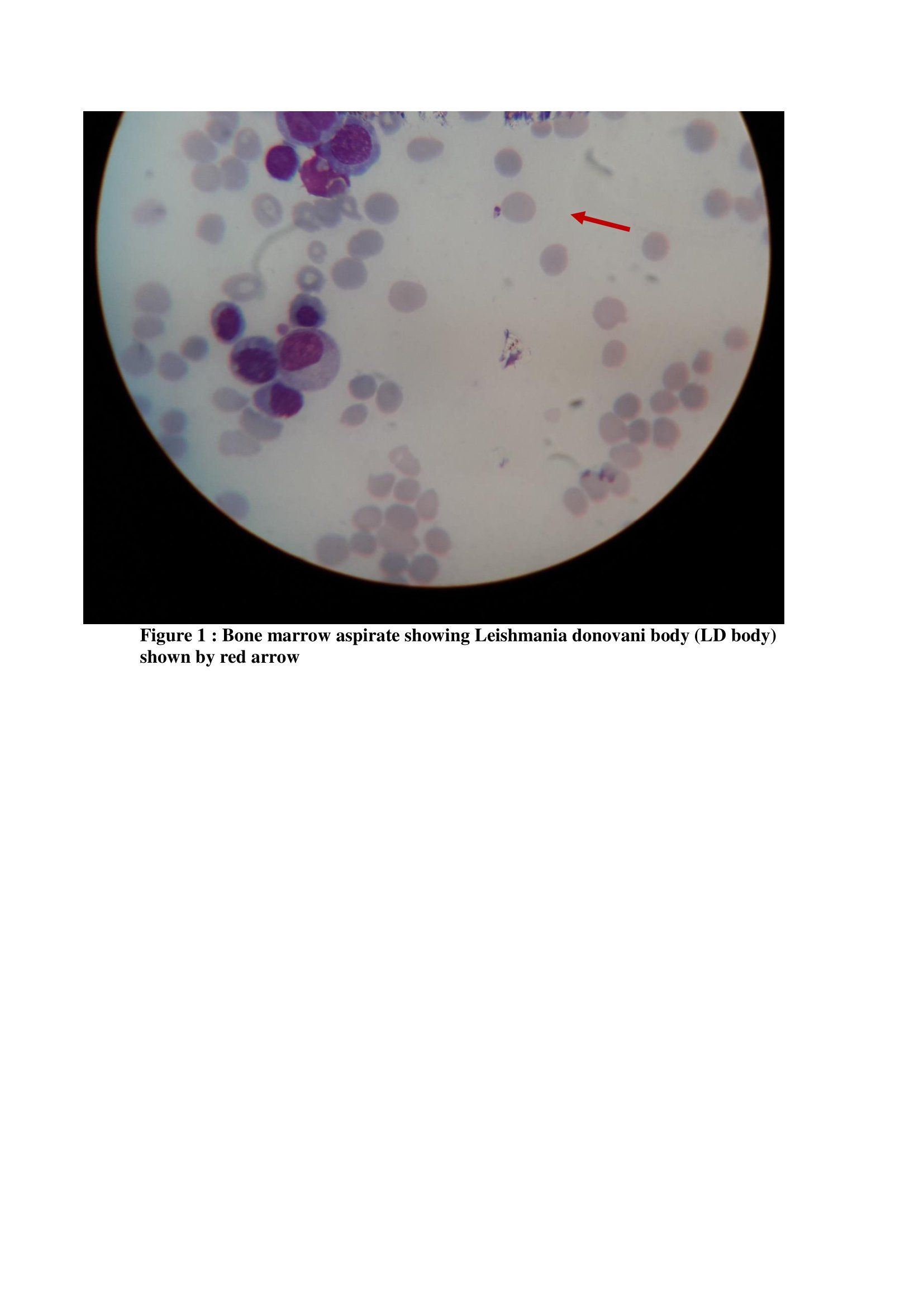 About 8 months later, he was admitted in the present facility with complaints of high-grade fever with chills, severe nausea, loss of appetite, weakness, and abdominal pain. Physical examination revealed pallor with mild hepatomegaly and huge splenomegaly with spleen palpable up to about 10cm below left costal margin along splenic axis. Laboratory investigations revealed pancytopenia. Chest X-ray was normal, urine and blood culture also did not confer any growth. HIV,HBsAg and anti-HCV were all found to be non-reactive. Owing to his past history of VL, and the patient presenting with fever, progressive weight loss, hepatosplenomegaly, pancytopenia with hypergammaglobulinemia from an endemic region, he was considered to be a case of relapse VL. Bone marrow aspiration study was done, splenic aspirate avoided due to risk of complications. Bone marrow study showed amastigote form of the parasite. (Figure 1) Diagnosis was confirmed. He was then given L-Amb 15mg/kg dose Intravenous single dose. He also received 2 units PRBC for his anaemia. With therapy, his clinical condition improved and patient was discharged. After 7 months, patient was again readmitted with high grade intermittent fever for two weeks, with abdominal pain, anorexia and nausea. On examination, he had severe pallor, mild hepatomegaly with hugely enlarged spleen. Complete blood count showed haemoglobin- 3.5g%, Total WBC 1100/mm3, platelet- 60,000/mm3. He was given PRBC transfusion. Liver function test showed total bilirubin-0.7 mg/dl; albumin- 4.5g/dl, globulin – 2g/dl, SGOT-52U/L, SGPT-27U/L, ALP- 126U/L, urea and creatinine were within normal limits. Malaria was ruled out. Scrub IgM was non-reactive. Urine routine and microscopic examination revealed trace albumin, pus cell: 1-2/hpf. Urine and blood culture showed no growth. ICTC and HBsAg and anti-HCV were repeated and were again non-reactive. Whole abdomen ultrasound revealed mild enlarged liver with hugely enlarged spleen-24cm. CD4 count was done and was found to be 195cells/mm3. Bone marrow aspiration study was done, where LD body was found. (Figure 2)