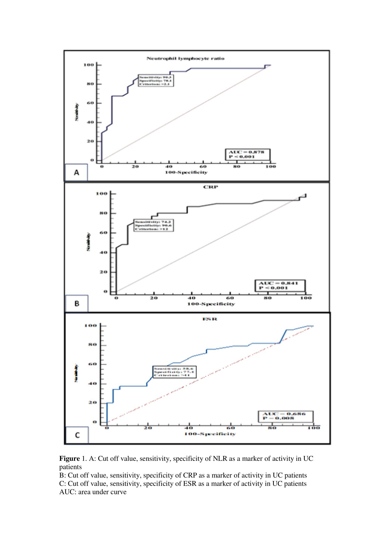NLR was found to have a significant association with WBC count (r = 0.474, P 0.001) as well as CRP (r = 0.498, P 0.001) in our study, but not with ESR (r = 0.218, p = 0.097). Demir et al., found associations that are statistically significant among NLR, ESR (r = 0.170, p = 0.043) and WBC count (r = 0.282, p = 0.001) in a sample of individuals with UC. Patients with UC showed no relationship between CRP and NLR (r = 0.102, P = 0.153) this may be related to the large number of control group in their study (140 individuals) in relation to UC groups (70 individuals) [15].