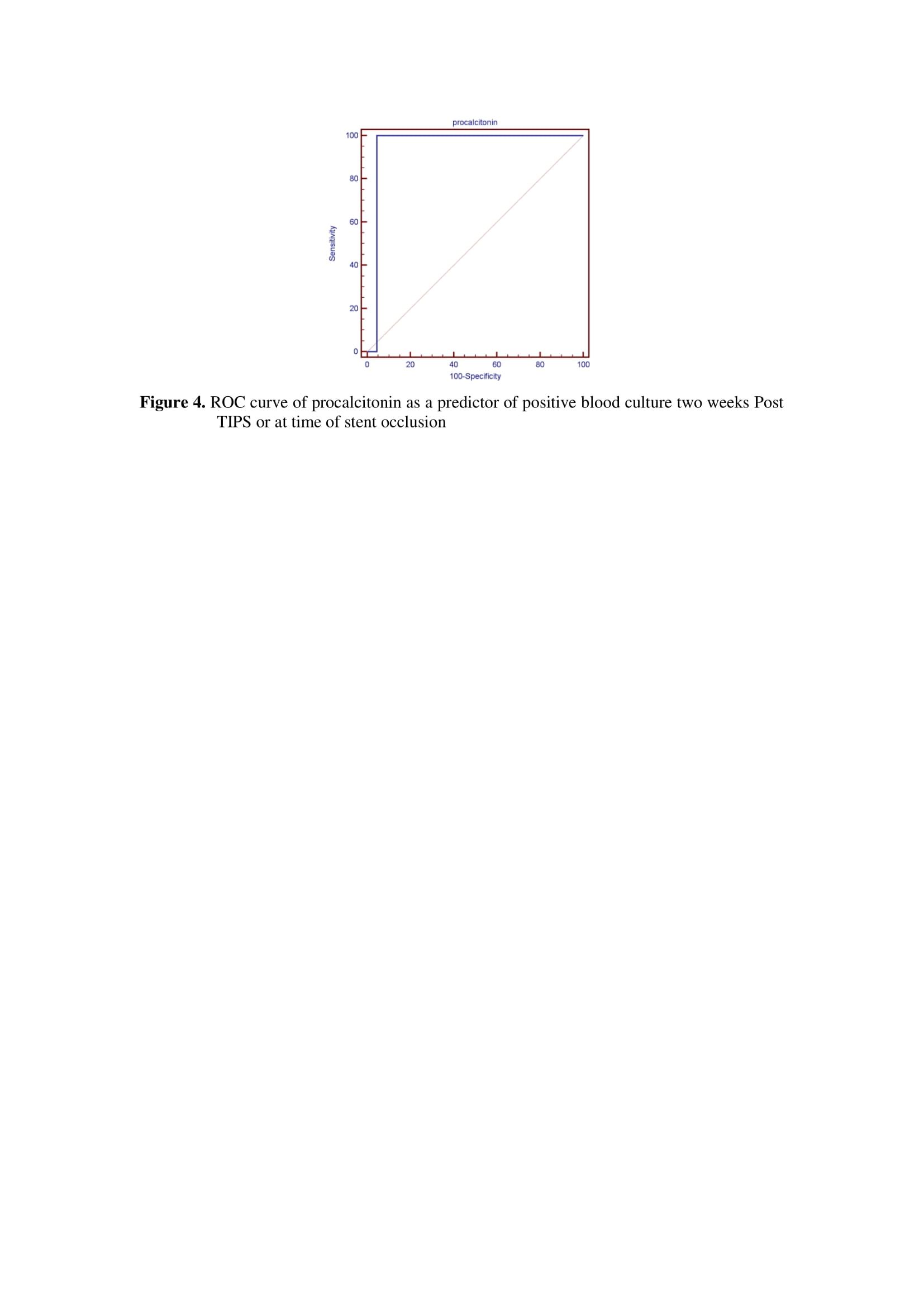 Procalcitonin's ROC curve as a predictor of positive blood culture results two weeks after TIPS or at the time of stent occlusion demonstrates 100% sensitivity and 95.6% specificity (at a cutoff value of 0.11 ng/ml), with 66.7% positive predictive value and 100% negative predictive value in identifying blood culture positive results (Figure 4).