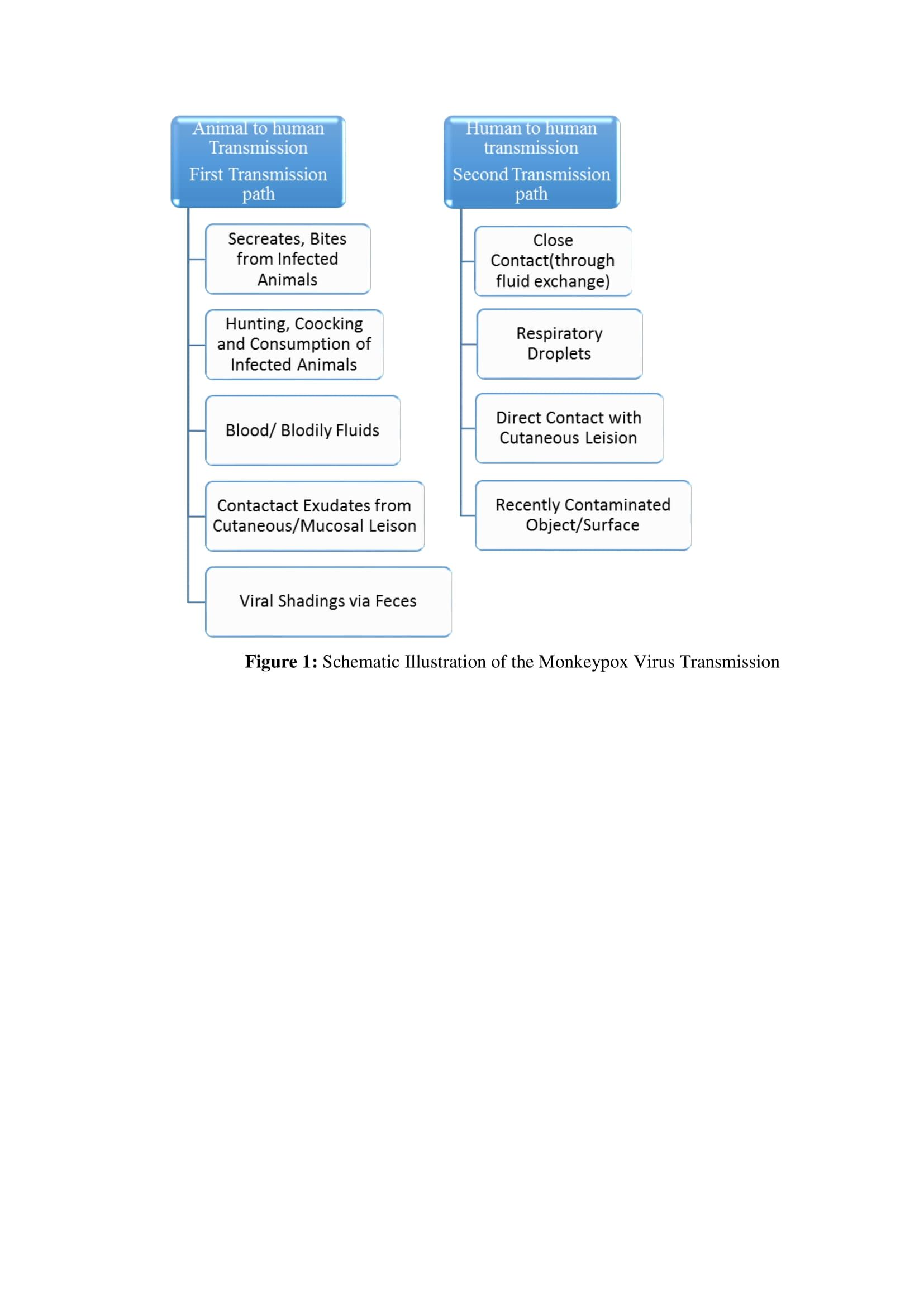 There are several modes in which the MPXV is transmitted, all of which depend on direct exposure with infected reservoir animals or infected humans (Figure 1) [20]. Generally, contact with infected animals have connected to human infections. However, specific exposure to human case can be difficult to determine in communities/areas where contact with animals is common either through household rodent infestations, hunting or preparation of bush meat from a variety of species [21]. Until now, the actual route of MPX transmission is still unclear, but those represented below (Figure 1), considered as the suspected routes of transmission and also highlighted as the risk factors to contract MPX infection [9, 20]. Zoonotic transmission of MPX is considered by direct contact or exposure to bodily fluids such as saliva, respiratory excretions or exudates from cutaneous or mucosal lesions from infected animal. Viral shedding via feces may represent another source of infection [22, 20]. In poor resources and infrastructure setting especially in MPX endemic region of Africa, exposure to the feces of infected animals can be an important risk factor, because in this settings individuals have no options than to live closely to the suspected reservoir animals or visit the forest in search of items for domestic use, where infected animals are much more prevalent [9]. In a community with limited resources, such as food, individuals are left with no option then to feed from small mammals, which in-turn accelerate the risk of exposure to MPX. Despite the fact that transmission from one person to another is less common than zoonotic transmission, it usually through respiratory droplets with closed and prolonged face-to-face contact or contact with lesions from an infected individual [16]. Contaminated objects and surfaces, such as sleeping on the same bedding, living in the same household, or eating or drinking from the same dishes with an infected individual, are deemed a risk factors for MPX transmission among individuals in the same household. Despite the current, ongoing MPX epidemic, whether it’s transmitted via sexual contact is not known, as disclosed by the World Health Organization (WHO); however, the transmission can be generally linked to close contact with infected human or animal [23].