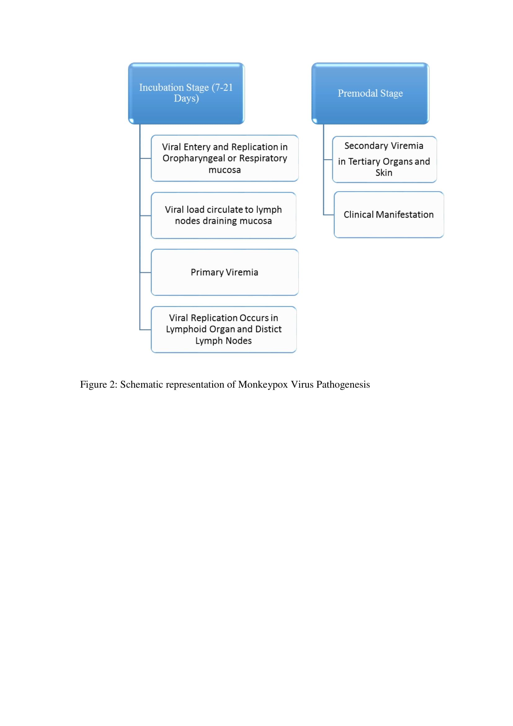 Although individual’s transmission of MPX is uncommon, the most common cause considered is respiratory droplets. The pathogenesis of the MPXV follows a similar pattern to that of smallpox, initiating with the exposure of the oropharyngeal or respiratory mucosa of the person infected with the virus [20]. Following entry, Monkeypox virus replicates at the site of inoculation. The respiratory and oropharyngeal mucosa were the sites of inoculation in human-to-human transmission. Following viral replication, in primary viremia, the virus spreads to the local lymph nodes, while in secondary viremia, the virus move to the far lymph nodes and organs through circulation [24]. The outbreak of the MPXV was reported with sustained transmission between men who have engaged in sexual intercourse, especially gay men [25]. The entire process described above represents the period between the exposure to the initiation of symptoms, ideally lasting seven (7) to fourteen (14) days with maximum of 21 days [20]. It is not contagious at the incubation stage because at this stage, the clinical manifestation of Monkeypox is not visible [20]. The symptoms and clinical manifestations of Monkeypox can be similar to the prodromal stage. During the prodromal stage, secondary viremia occurs from the lymphoid organs to the skin and tertiary organs such as the lungs, eyes, gastrointestinal tract, etc. It is during this state that; an individual confirmed to be highly infectious. This is absolutely due to the appearance of signs and symptoms such as cutaneous lesions and lymphadenopathy, among other non-specific symptoms.