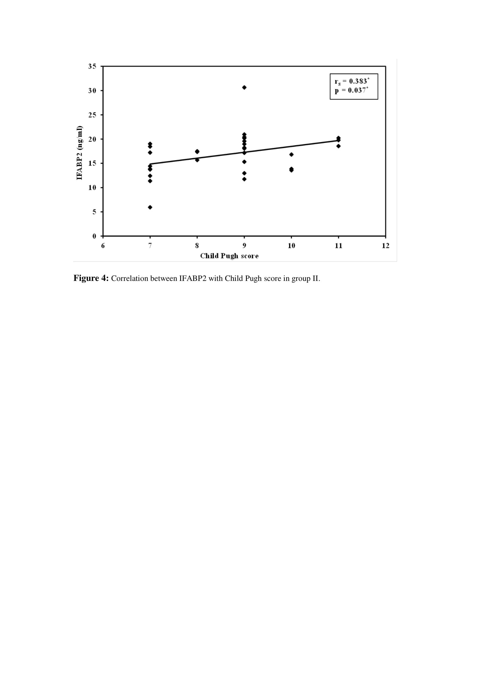 IFABP2 correlated positively with different laboratory parameters as AST (rs =0.466, p=<0.001), total bilirubin (rs =0.371, p=0.004), AFP (rs =0.362, p=0.005) prothrombin time (PT) and INR (rs =0.336, p=0.009) while correlated negatively with serum albumin (rs =-0.591, p<0.001). A significant positive correlation was detected between IFABP2 with CTP score in all patients (rs =0.686, p<0.001) specially in group II (rs =0.383, p=0.037) as shown in Figure 4.