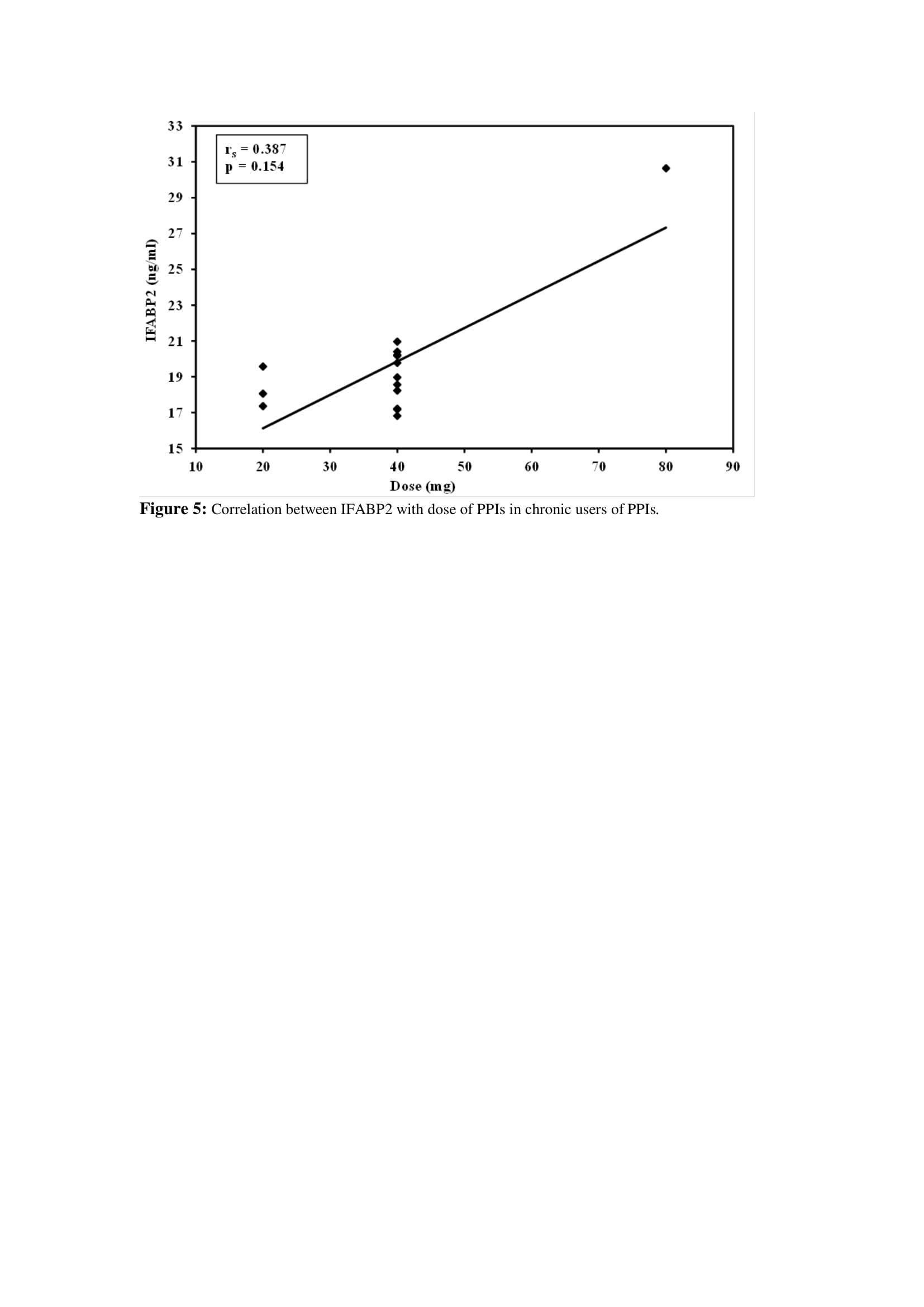 The most common proton pump inhibitors used among decompensated cirrhotic was omeprazole representing 46.7% followed by pantoprazole and rabeprazole equally 26.7%. The dose of PPIs ranged from 20 to 80 mg and the duration of PPIs ranged from 4 to 24 months. No significant correlation was found between IFABP2 with dose & duration of PPIs as illustrated in Figures 5 and 6.