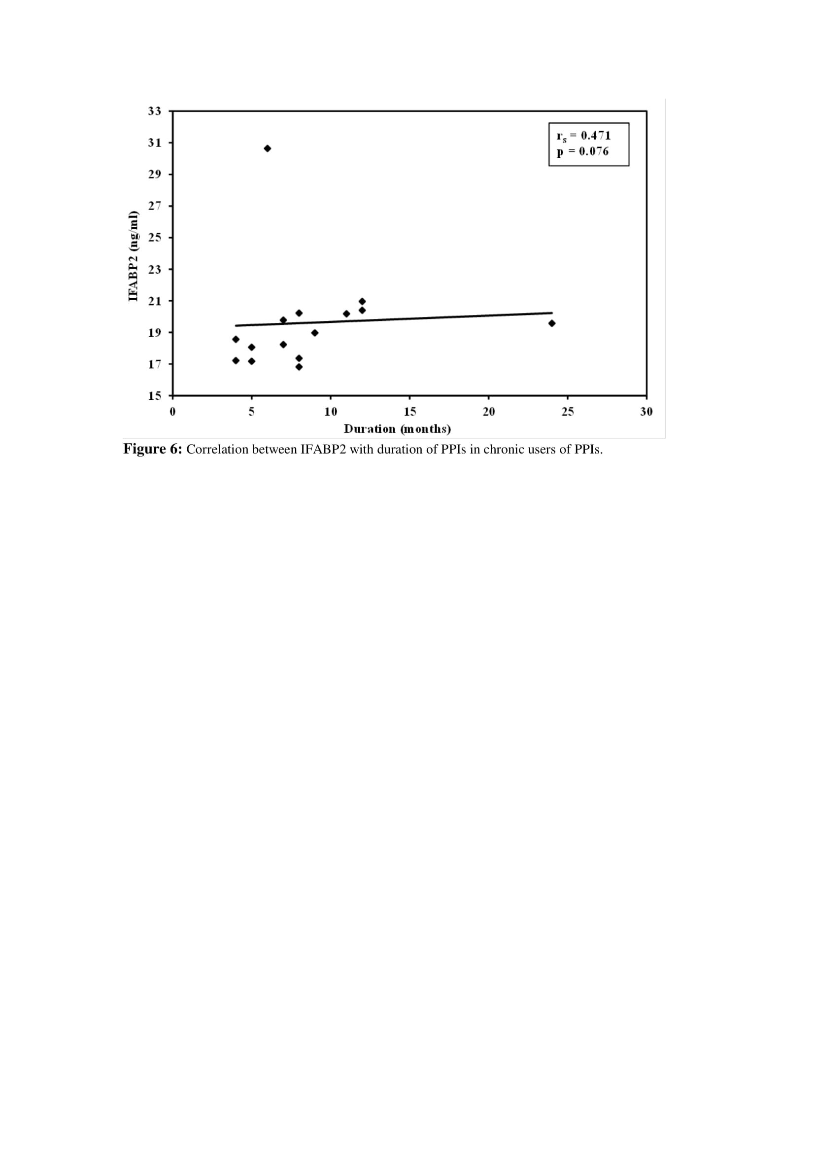 In our study, IFABP2 was significantly of higher value in chronic users of PPIs than non- chronic users of PPIs and healthy controls (p<0.001). This was in agreement with, Sturm L et al.’s study [27], who assessed I-FABP , procalcitonin, CRP and 3-nitrotyrosine in the blood of portal vein in a total of 80 patients with advanced cirrhosis during insertion of transjugular intrahepatic portosystemic shunt (TIPS). The patients were categorized into 2 groups: group I with PPI treatment (n= 57) and group II without PPI treatment (n= 23). The results showed significant higher values of IFABP in PPI users (p= 0.001) which confirmed aggravated bacterial translocation and gut inflammation caused by PPIs use in cases with decompensated cirrhosis.