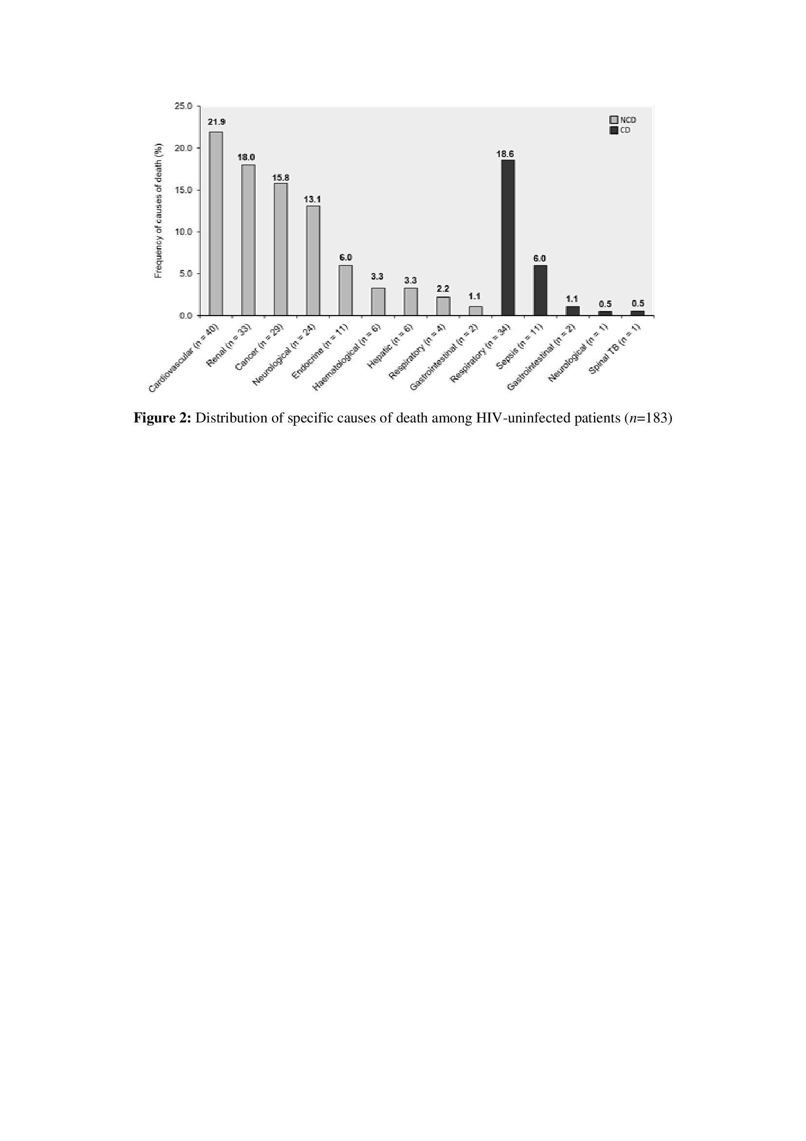 This study showed that among the NCDs, cardiovascular diseases (21.9%) were the most common cause of death followed by renal diseases (18.0%). Similar to our findings, a study conducted by Nojilana et al. [9] recorded cardiovascular diseases as the leading cause of death in South Africa. These findings are consistent with surveillance data and other studies that report cardiovascular diseases as the leading cause of death among NCDs [8,10]. Among the communicable diseases, respiratory infections (18.6%) were the most common cause of death in this study cohort. A study conducted in Tanzania reviewing medical records of patients who died in 39 hospitals from 2006-2015, recorded 12.9% (32 042/247 976) deaths due to respiratory infections [11]. Deaths due to respiratory infections in their study is slightly lower compared to the current study.