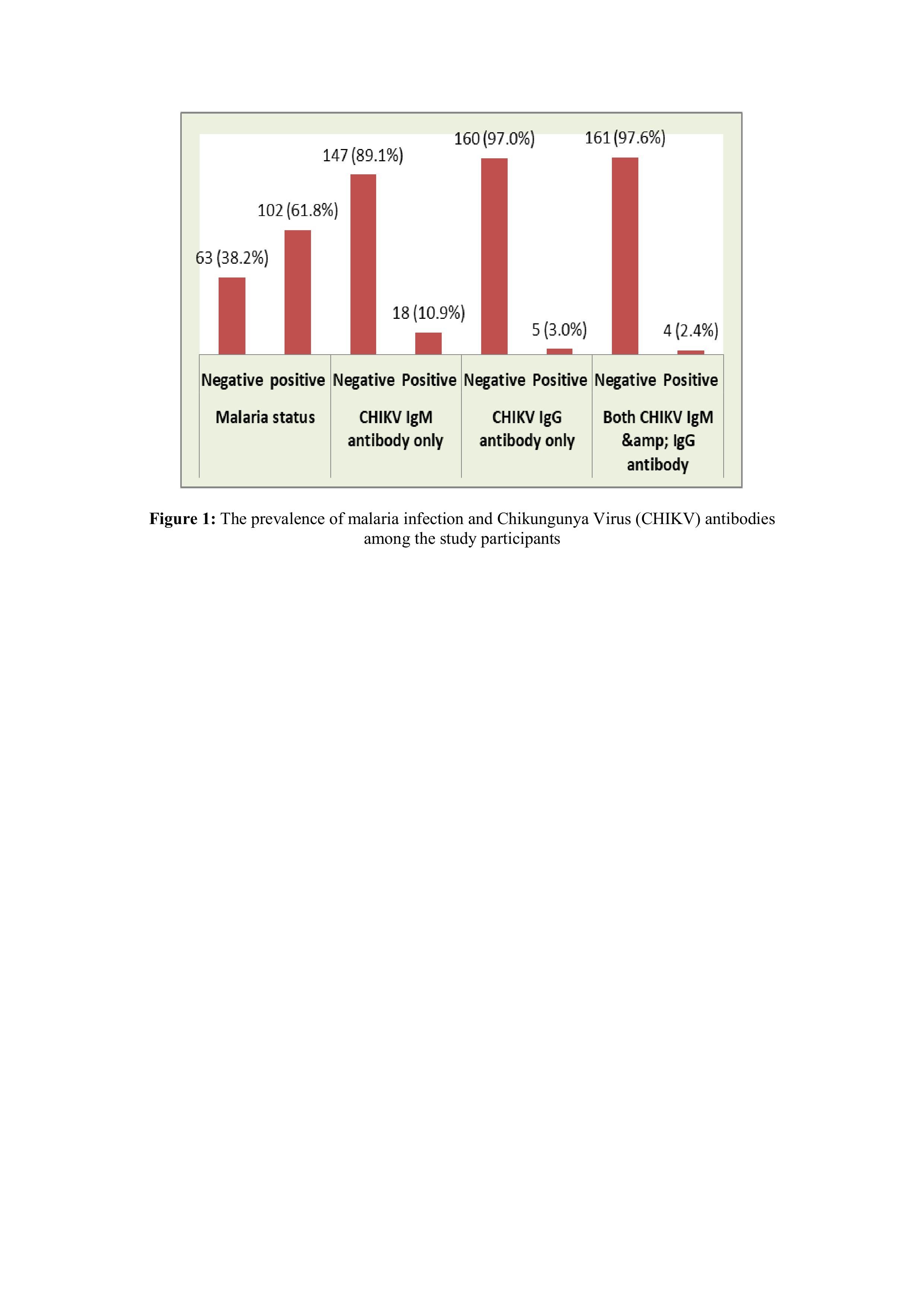 The prevalence of malaria infection and Chikungunya Virus (CHIKV) antibodies among the study population is presented in Figure 1. The majority of study participants were positive for malaria parasites (102, 61.8%), while 63 (38.2%) tested negative. Regarding CHIKV antibodies, a small proportion of study participants tested positive for CHIKV IgM antibodies only (10.9%), CHIKV IgG antibodies only (3.0%), and both CHIKV IgM and IgG antibodies (2.4%). The prevalence of CHIKV antibodies suggests some exposure to the virus within the population, albeit at a lower rate compared to malaria.