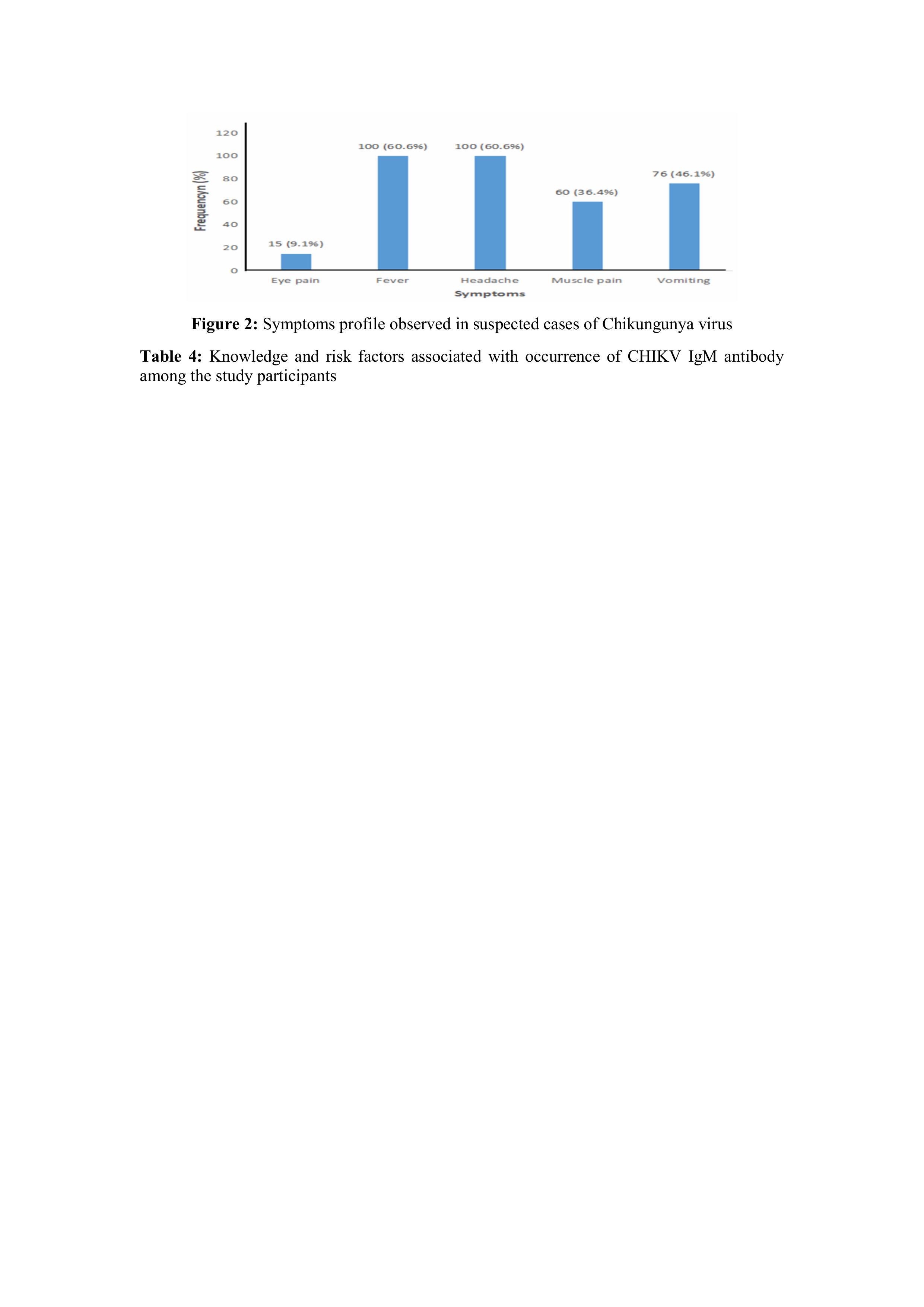 Figure 2 shows the symptoms profile observed in suspected cases of Chikungunya virus infection. Among the reported symptoms, fever (>40°C) is prevalent, with 60.6% of respondents experiencing it, followed closely by headache, also reported by 60.6% of respondents. Muscle pain is another common symptom, reported by 36.4% of respondents. Additionally, vomiting is noted in 46.1% of cases. Eye pain, while less common, is still present in 9.1% of cases. Table 6 shows the occurrence of Chikungunya virus) IgM antibodies according to the socio-demographic characteristics of the study participants. The analysis of the data reveals no significant association between gender and CHIKV IgM antibody positivity (χ² = 1.293, df = 1, p = 0.255). Similarly, age range does not exhibit a significant association with antibody positivity (χ² = 6.098, df = 5, p = 0.297), indicating that age group alone may not be a determining factor for susceptibility to Chikungunya virus. Religious affiliation also does not demonstrate a significant association with antibody positivity (χ² = 0.325, df = 2, p = 0.850). Moreover, tribal identity (χ² = 0.605, df = 2, p = 0.739), marital status (χ² = 1.323, df = 2, p = 0.516), educational status (χ² = 2.020, df = 3, p = 0.568), residential location (χ² = 2.346, df = 1, p = 0.126), and occupation (χ² = 4.813, df = 5, p = 0.439) do not demonstrate significant associations with CHIKV IgM antibody positivity. These results suggest that none of the socio-demographic factors examined in this study have a statistically significant impact on the occurrence of Chikungunya virus antibodies.