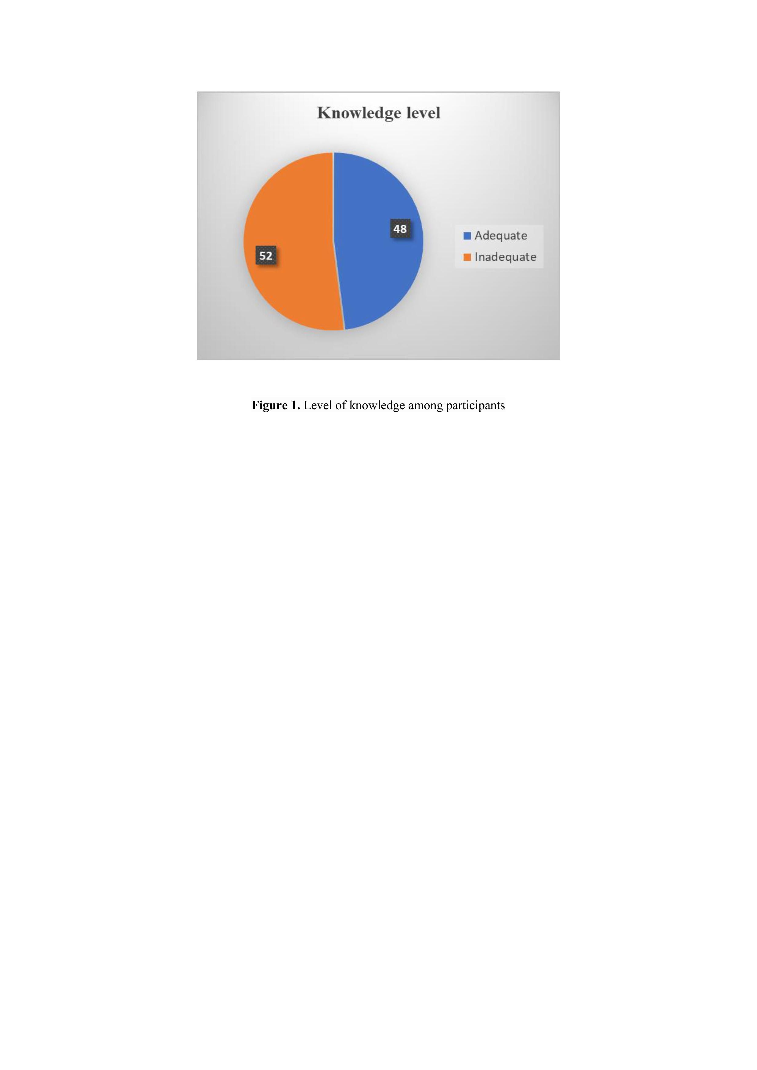The results in Table 2 showed that the mean knowledge of the response was 46%, a maximum score of 90%, and a minimum score of 0% in descriptive statistics. Most of the respondents, 84 (84%), were aware that diabetic people could not donate blood, 68 (68%) were aware that people under medication could not donate blood, 64 (64%) were aware that people living with HIV/AIDS could not donate blood and 62 (62%) were aware that people with hepatitis could not donate blood. Most respondents showed poor knowledge on questions asked about the maximum age for voluntary blood donation, criteria for someone to donate blood, and the best source for blood donation by 16 (16%), 25 (25%), and 26 (26%), respectively. This study revealed that 48% and 52% of participants holding adequate and inadequate knowledge respectively, as shown in Figure.