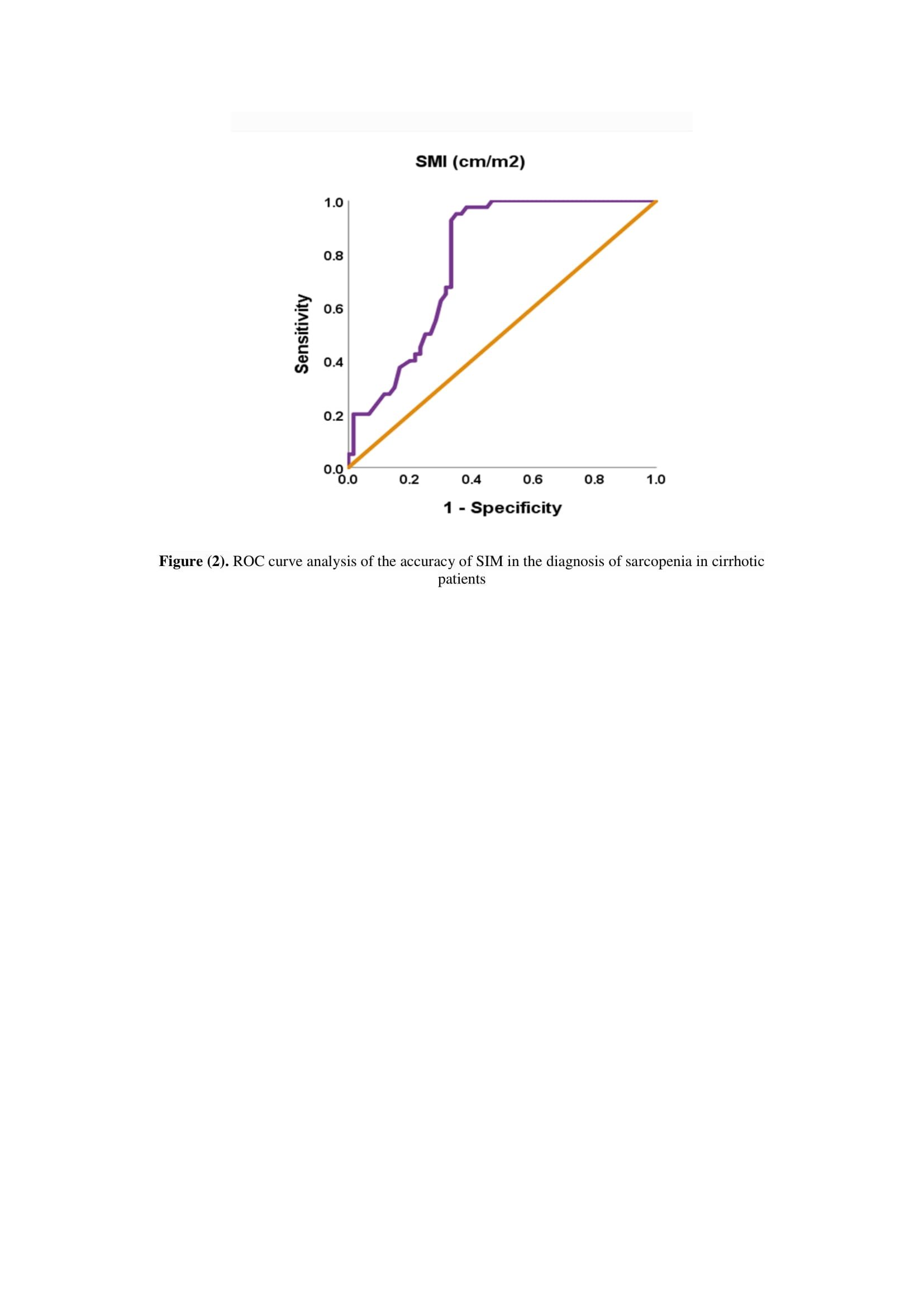 The current study showed that the diagnostic accuracy of irisin in diagnosis of sarcopenia in cirrhotic patients had a sensitivity 93%, specificity 63%, cutoff point 12.35 And AUC=0.700, (95% CI of AUC=0.592-0.807), and the diagnostic accuracy of SMI in diagnosis of sarcopenia in cirrhotic patients had sensitivity 87%, specificity 67%, cutoff point 27 And AUC=0.783, (95% CI of AUC=0.694-0.872).