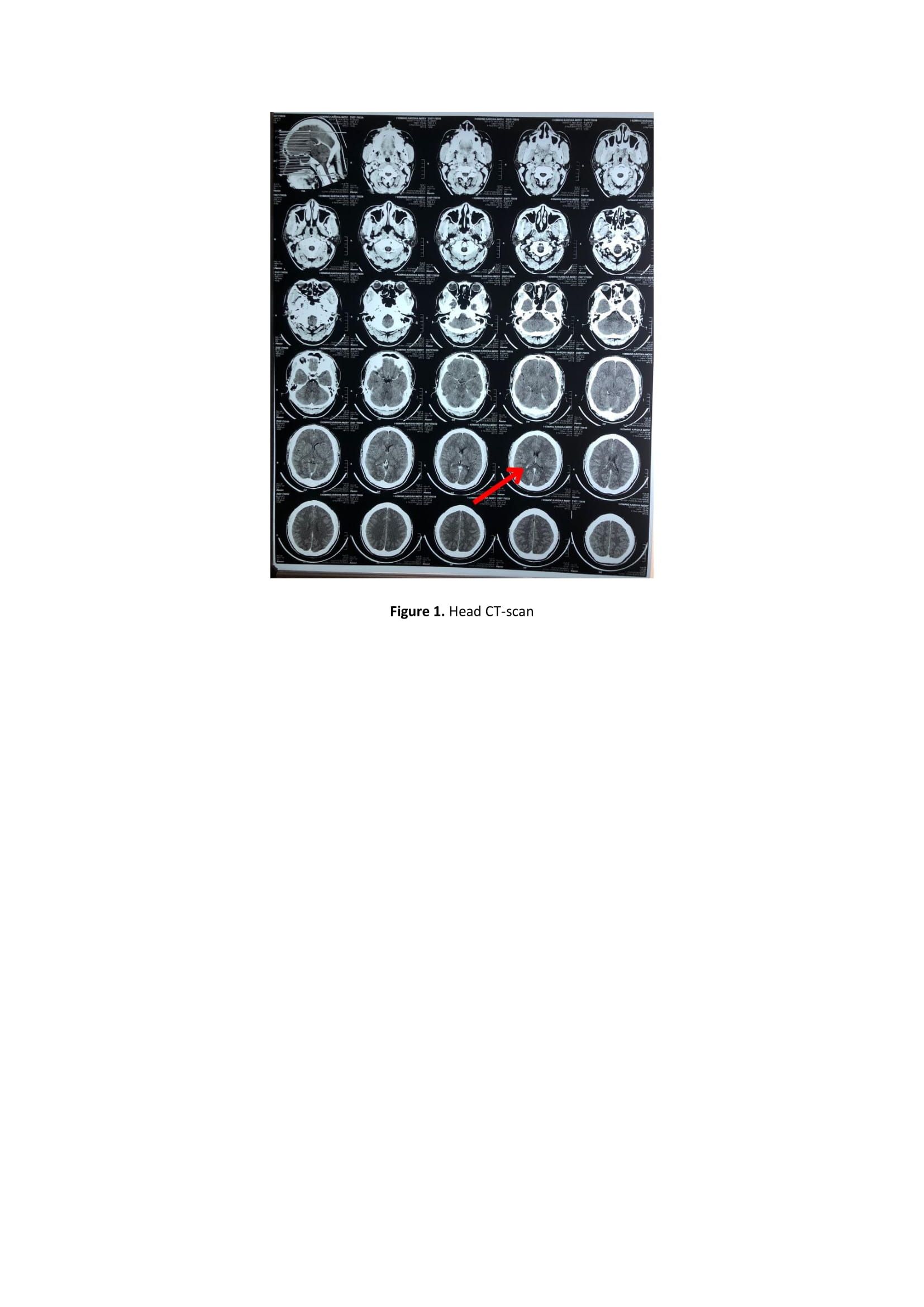 Head CT-scan for this patient were conducted to confirm the diagnosis. Head CT-scan showed an oval lesion with heterogeneous density measuring +/- 0.7 x 0.6 x 0.7 cm in the right centrum semiovale with a central dot inside and minimal perifocal edema. Ring contrast enhancement is observed when contrast is administered.