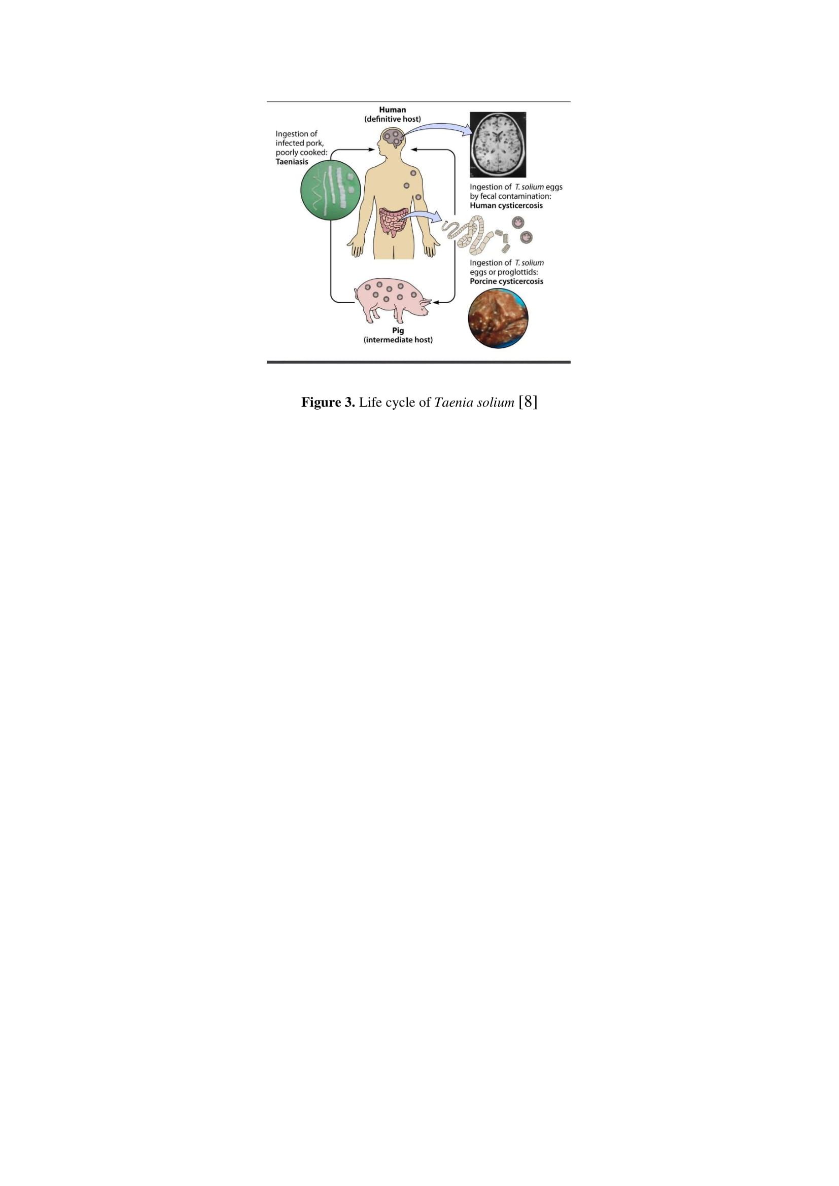 Taenia solium is a human tapeworm that can cause two clinical presentations: taeniasis if adult worms found in the small intestine and cysticercosis if cyst/larval stage found in the tissue.[6] Pigs and humans are hosts in the natural life cycle of Taenia solium. Pigs can ingest human feces carrying embryonated eggs (or gravid proglottids) and hence become intermediate hosts in countries with poor sanitation. The embryonated eggs will then hatch, pass through the intestinal wall, enter the circulatory system, migrate to numerous tissues, such as the striatal muscle, and develop cysticerci in this tissue.[8] The cysticerci will hatch in the small intestine when humans consume contaminated undercooked pork meat. The tapeworm then attaches itself to the intestinal wall using its scolex, a jaw-like structure containing suckers and hooks. This is called taeniasis.[9] Humans are also able to become intermediate hosts by consumption of foods or drinking water infected with Taenia solium eggs or by human-to-human transmission. The same situation as in the case of pork will occur, with the striatal muscle, subcutaneous tissues, central nervous system, and eyes being the most afflicted organs. The condition is known as neurocysticercosis when it occurs in the central nervous system.[3] We suspect that the patient we reported experienced neurocysticercosis through eating undercooked pork that contained Taenia solium eggs.