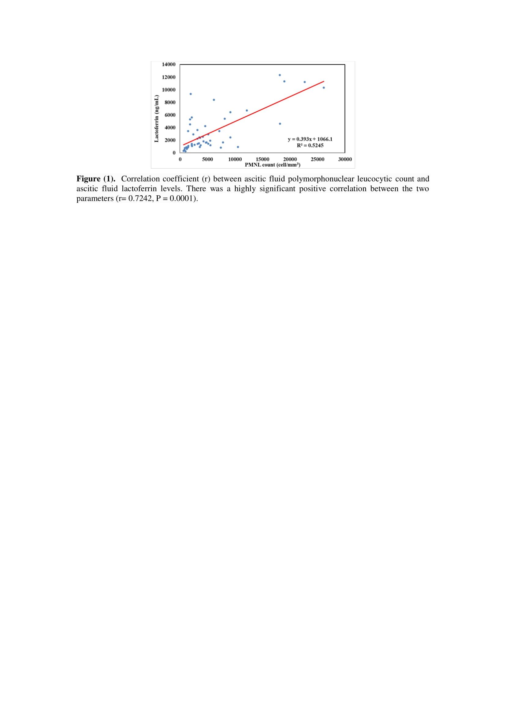 The previous result was explained by the observation that lactoferrin release from PMNLs is strongly connected with inflammatory markers such as WBC count, PMNL count, and CRP levels since it occurs mostly during inflammatory situations or infections. Lee et al. (2016) emphasized the possibility that lysis of PMN cells during laboratory transit could result in a false-negative result and raised the value of the relationship between lactoferrin levels in ascitic fluid and inflammatory markers in both ascitic fluid and blood.