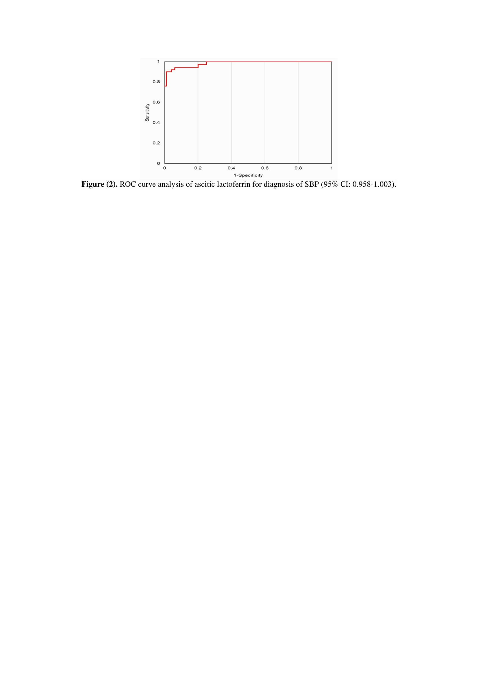 Lactoferrin's cut-off value in the current study was 246 ng/mL, with an AUC of 0.995, a sensitivity of 92.8%, a specificity of 89.6%, and an accuracy of 92.5% for the diagnosis of SBP. This outcome is approximate to that of Parsi et al. (2008) who found the cutoff level at 242 ng/ml with a 97% specificity and 95.5% sensitivity [4]. Also, Abulseoud et al. (2016) reported the cut-off level to be 255 ng/ml with the sensitivity of the test to be 100% and the specificity to be 88.9% [7]. This is also consistent with the findings of Khalifa et al. (2013) who found that the optimal threshold for diagnosing SBP was 270 ng/ml of ascitic lactoferrin based on ROC curve analysis. When ascitic lactoferrin concentration was ≥270 ng/ml, the diagnosis of SBP was 95.7% correct with 96% sensitivity, 95% specificity, 97.06% positive predictive value, and 90.5% negative predictive value [14].