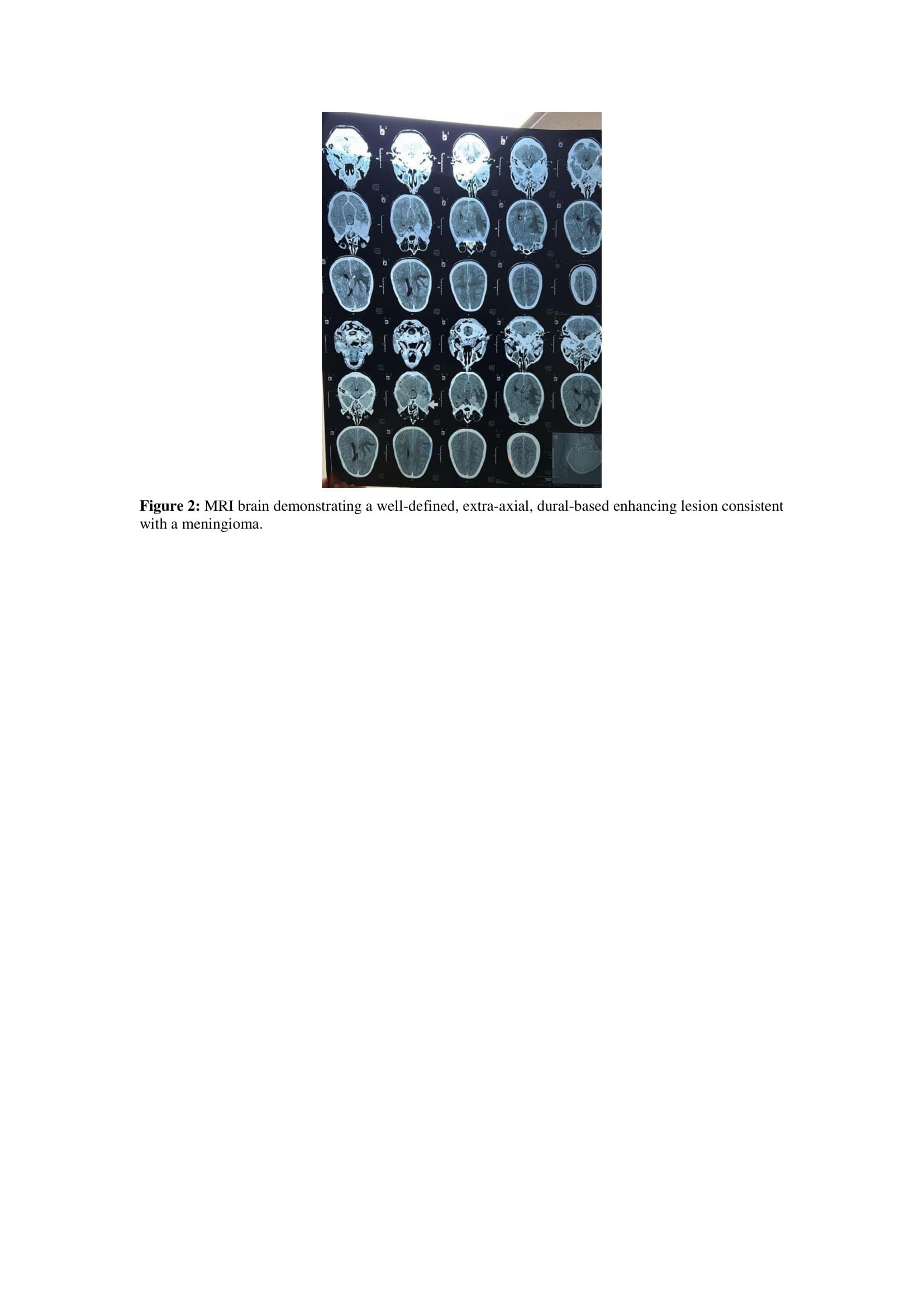 Meningiomas are the most common primary intracranial tumours, with an annual incidence of approximately 7.8 per 100,000 individuals [1]. They are more common in females, with a female-to-male ratio of approximately 2:1. The radiological findings in this case were characteristic of meningioma, including a dural-based, extra-axial mass with homogeneous enhancement and dural tail sign. These features are highly suggestive of meningioma and help differentiate it from other intracranial lesions.